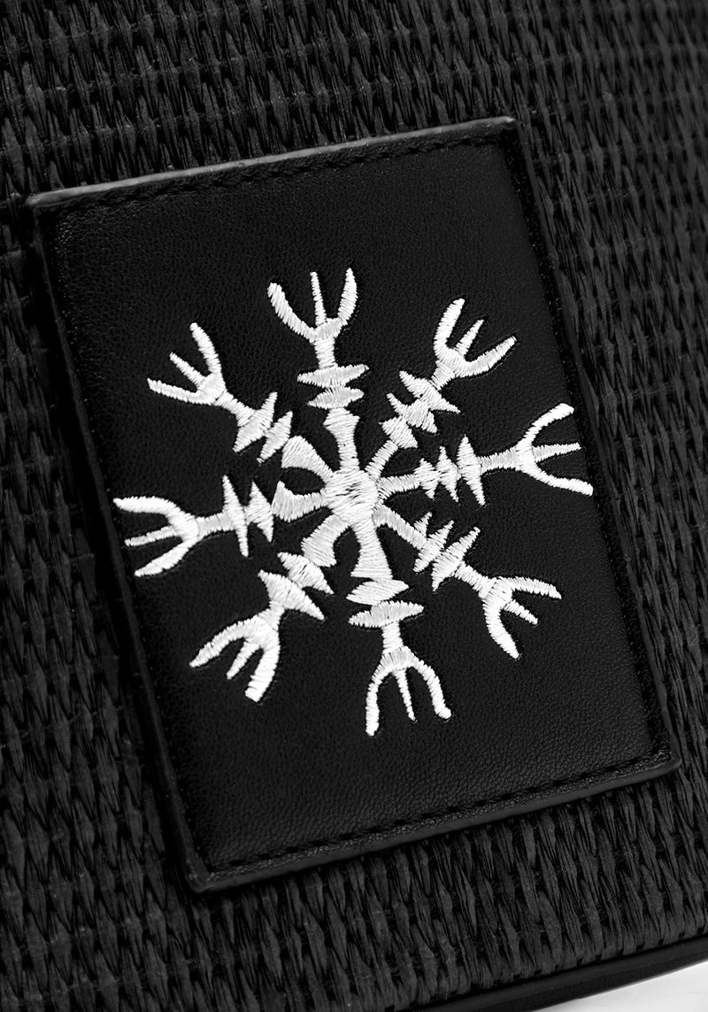 ✦ Contrasting white runic embroidery on top band and front patch pocketÂ