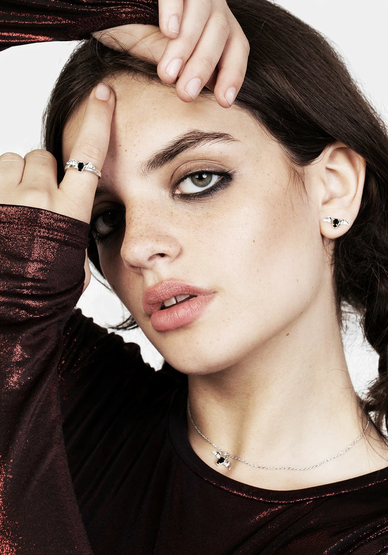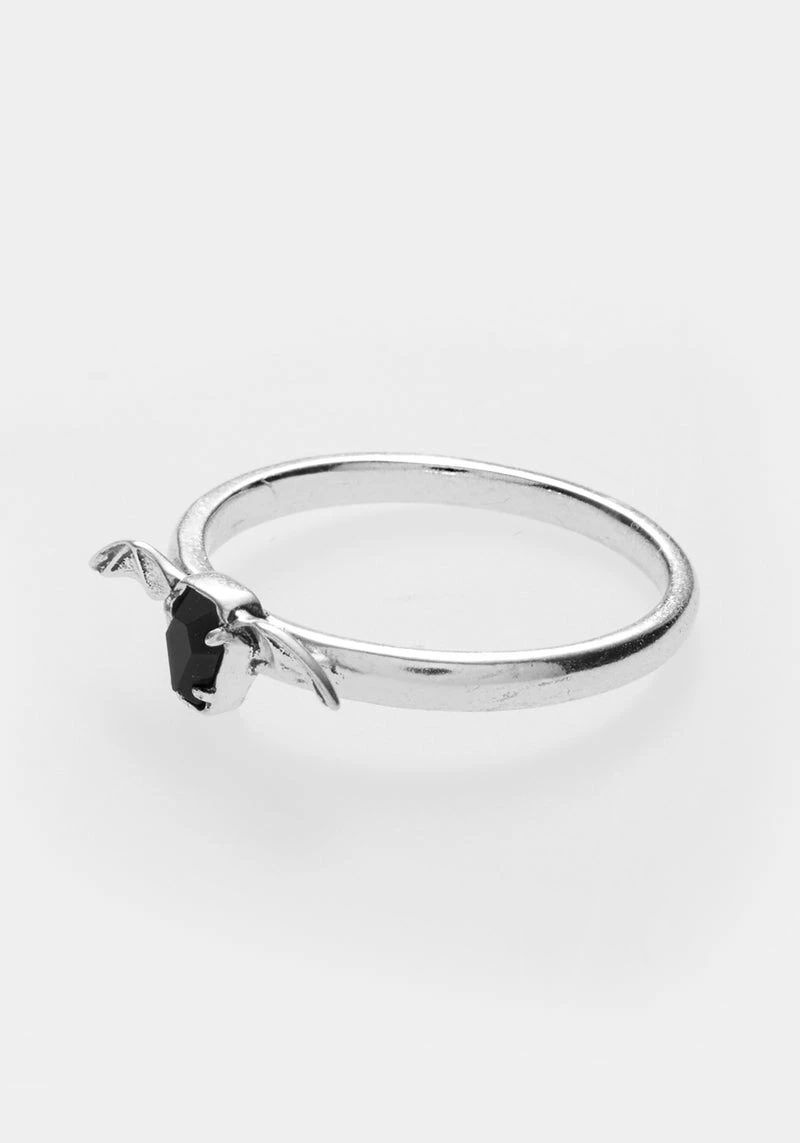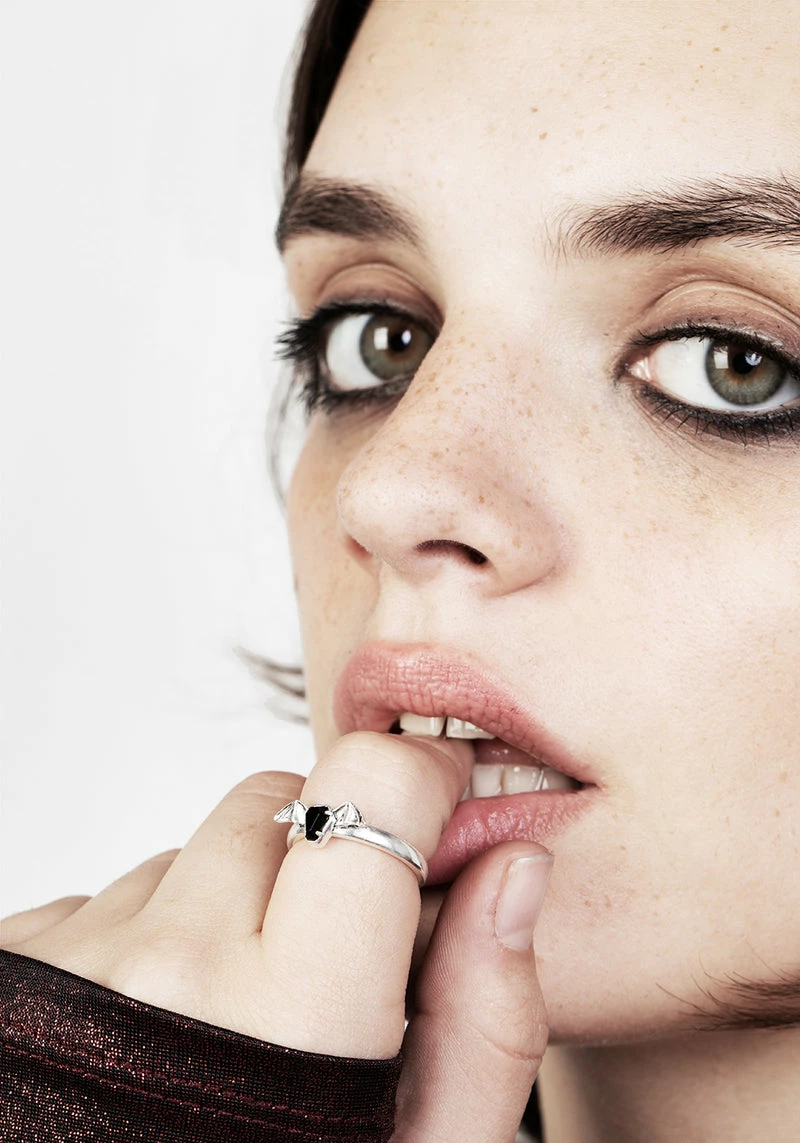 Do you hear that sound? It must be a bell ringing – it’s time to get your wings. Lift your spirits with this dainty ring featuring clean cut black agate in a gothic coffin shape, adorned with sculpted solid silver bat wings to carry you across this mortal coil. Who knows what the next life has in store for you!Â