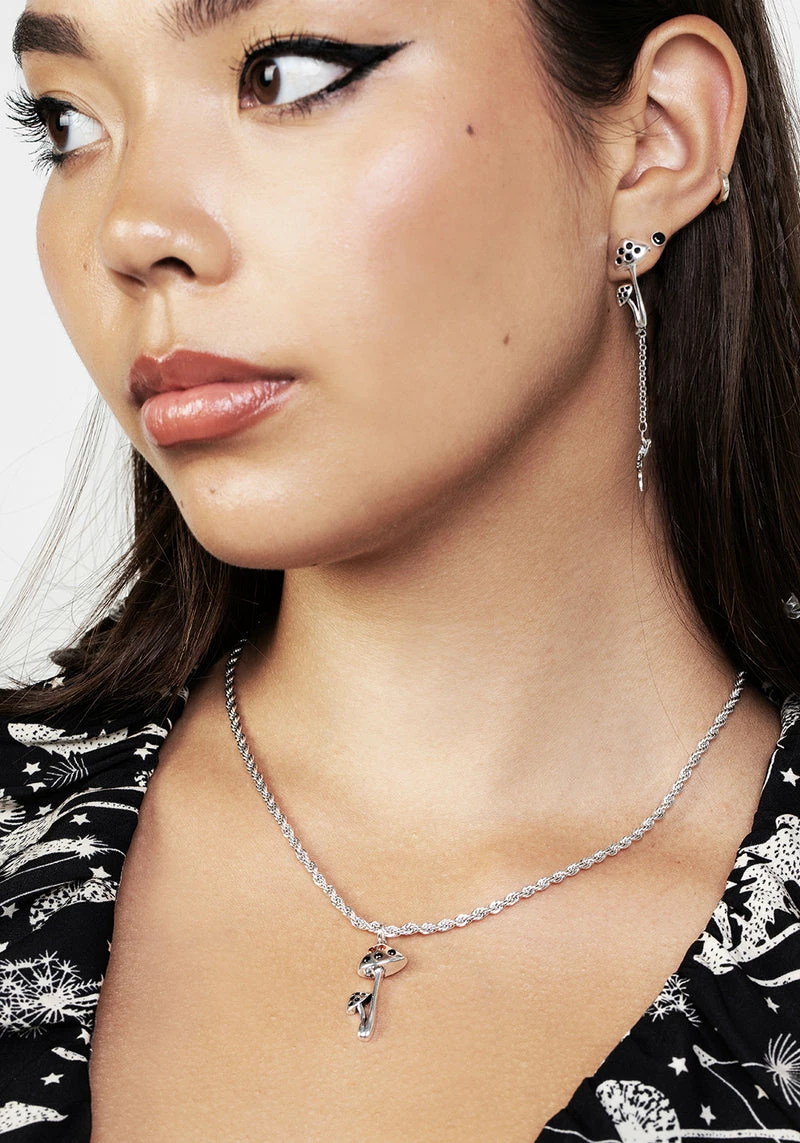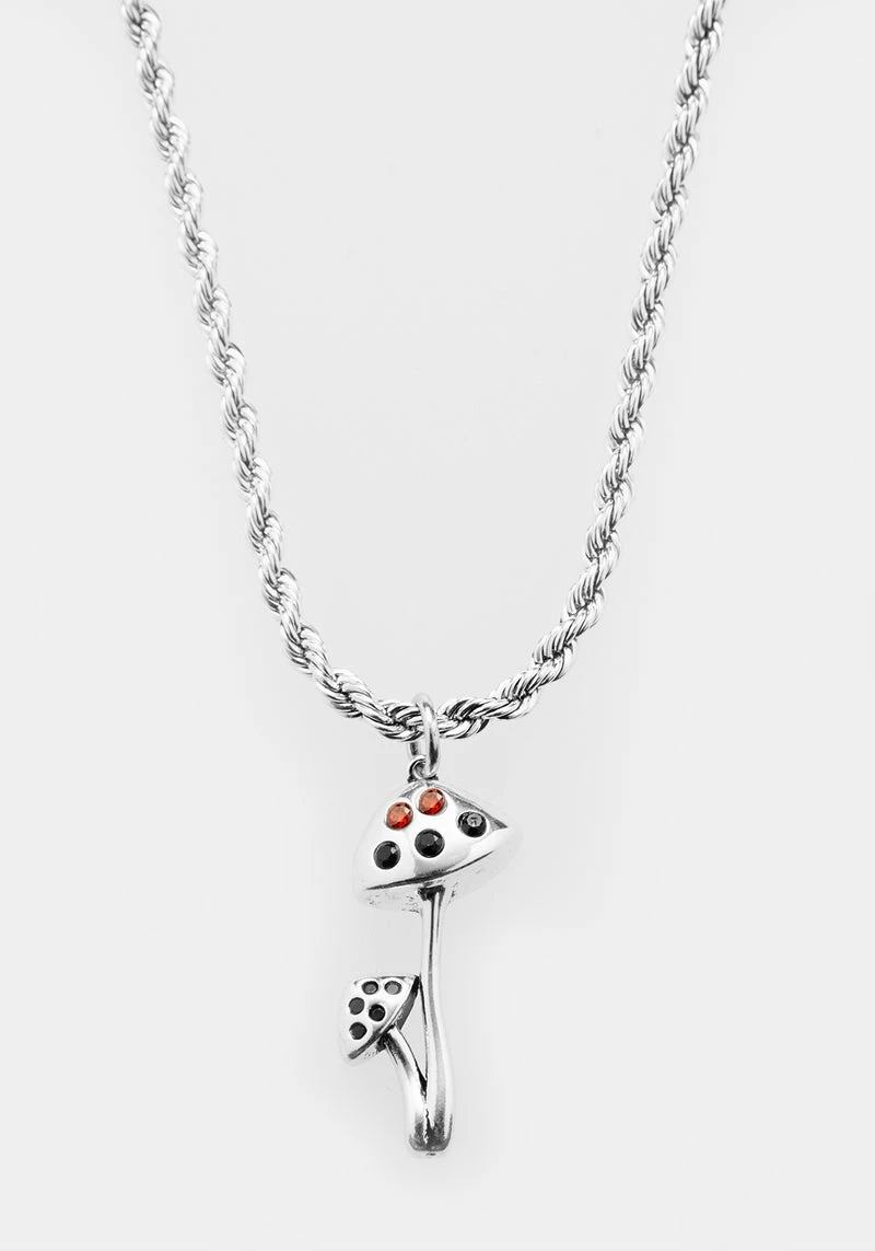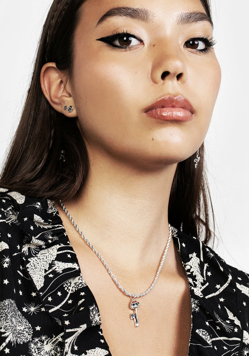 Grow closer to nature with this understated pendant necklace featuring a silver-plated Amanita Muscaria – better known as Fly Agaric – charm. The dual stemmed fungus hangs from a chunky twisted rope chain. Round faceted red and black cubic zirconia gems stud the ‘shroom caps to add sparkle and colour. You daily jewellery rotation needs this!