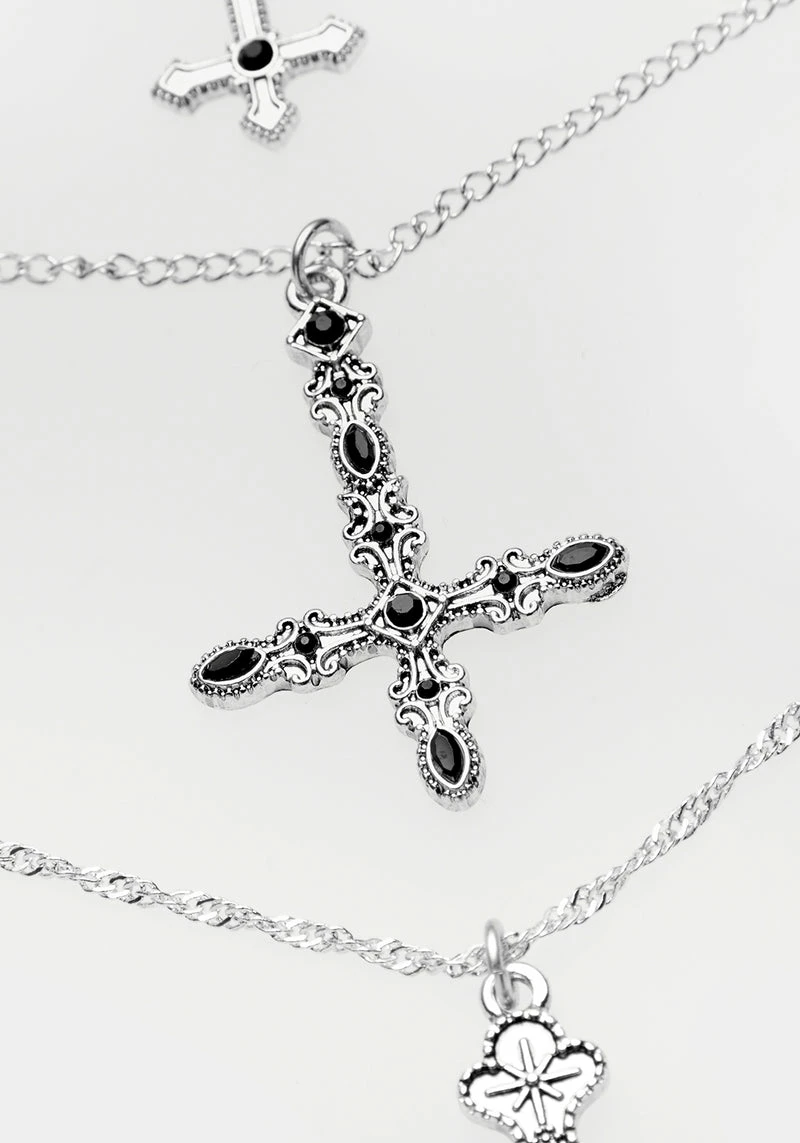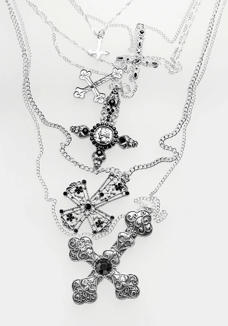Why settle for one necklace when you can have six? Drape yourself this multi-chain necklace for the ultimate layered look without any of the hassle. Each chain is adorned with an inverted cross encrusted in black faceted stones. This single piece features a careful curation of variety of link styles including figaro and flat curb chains so that you can make the most of your look with minimal effort.