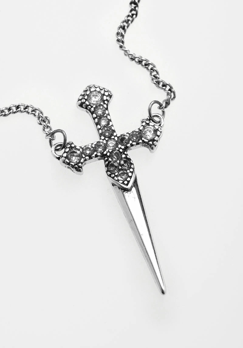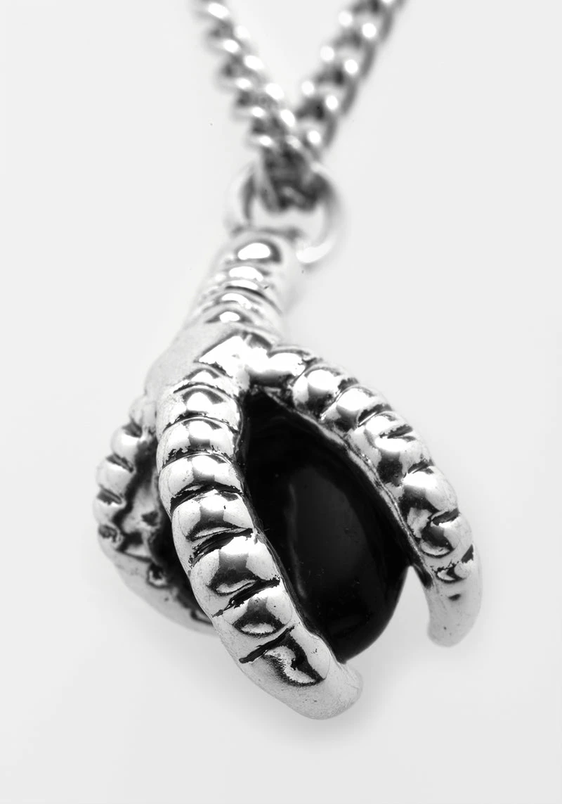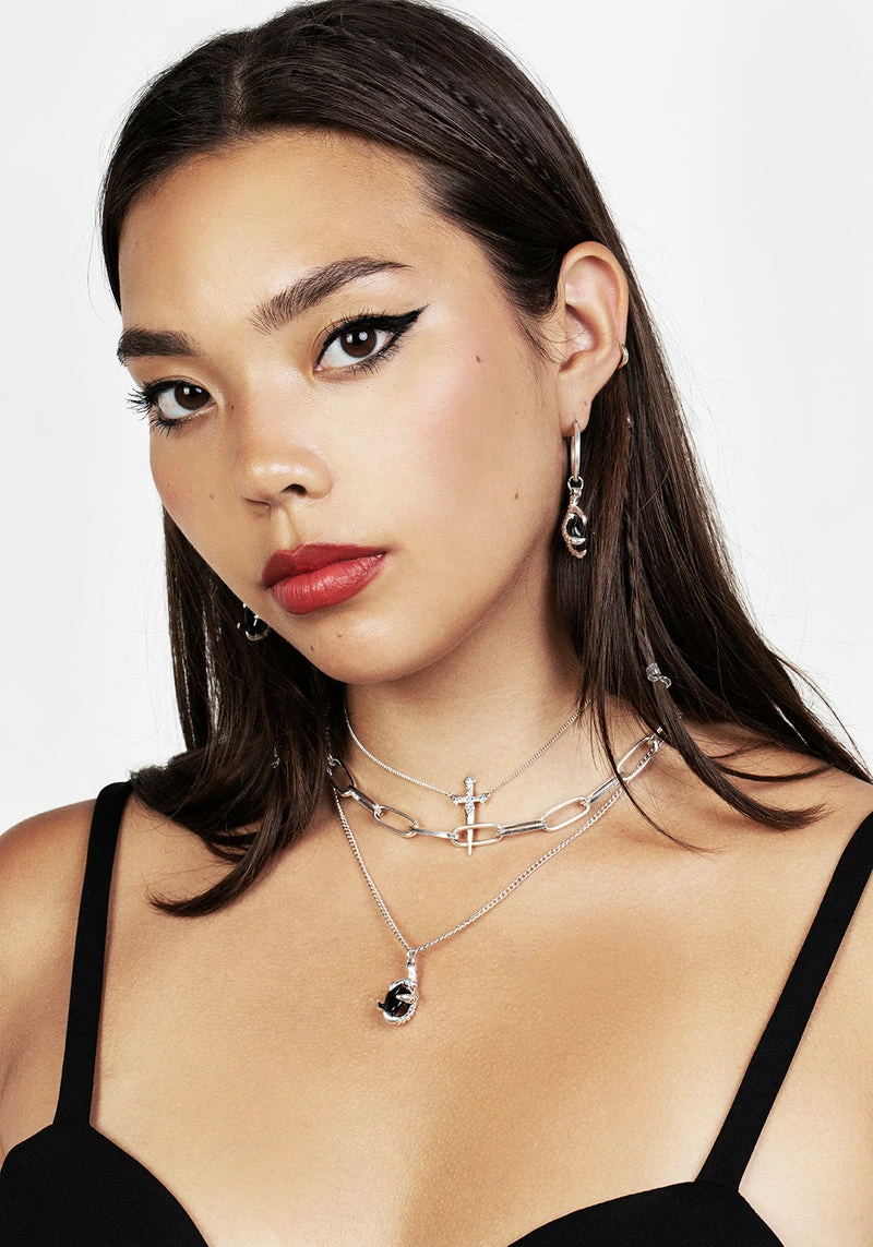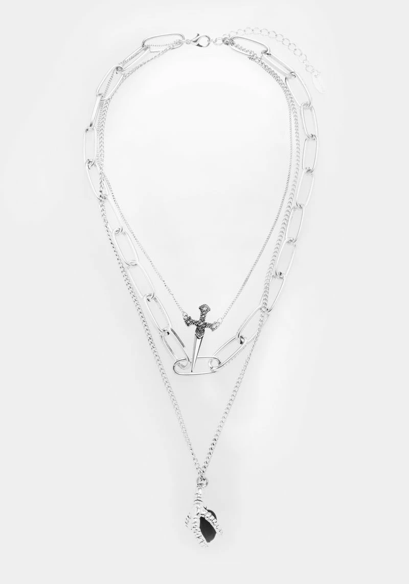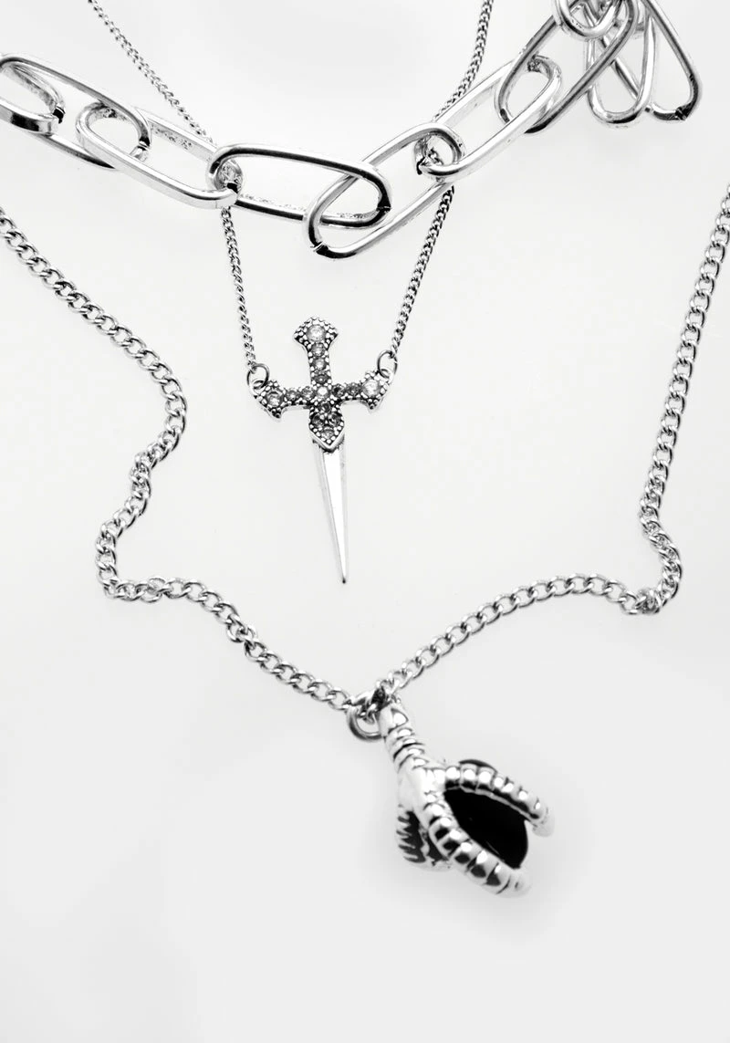 Don’t let the knights have all the fun: take up your sword and ready yourself for the quest of a lifetime. This black agate dragon egg charm set in a silver-plated claw is yours to bear; protect it with a black crystal faceted sword hanging from its delicate trace chain. Break it up with statement chunky oval link chain and become the hero of your own legend. Â