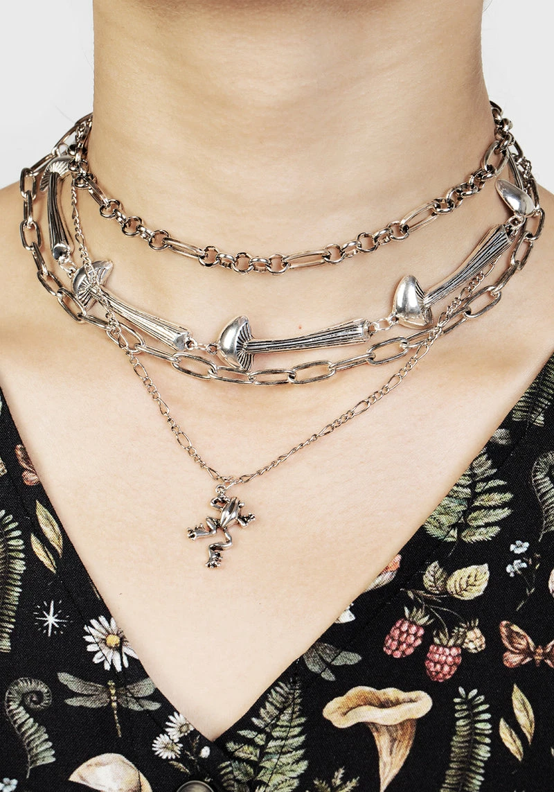 Everybody loves an underdog. Sneak in under the radar with the Lazarus Multi-Chain Necklace, featuring four chains of varying thickness and style to create the ultimate multidimensional look in one easy step. Figaro chains add subtle textural interest, while the statement mushroom charms speak to your inner swampwitch. We finished this piece off with a dainty frog charm front and centre to guide you on your journey. Complete the set with the Lazarus Earrings for your next foraging trip.  Â