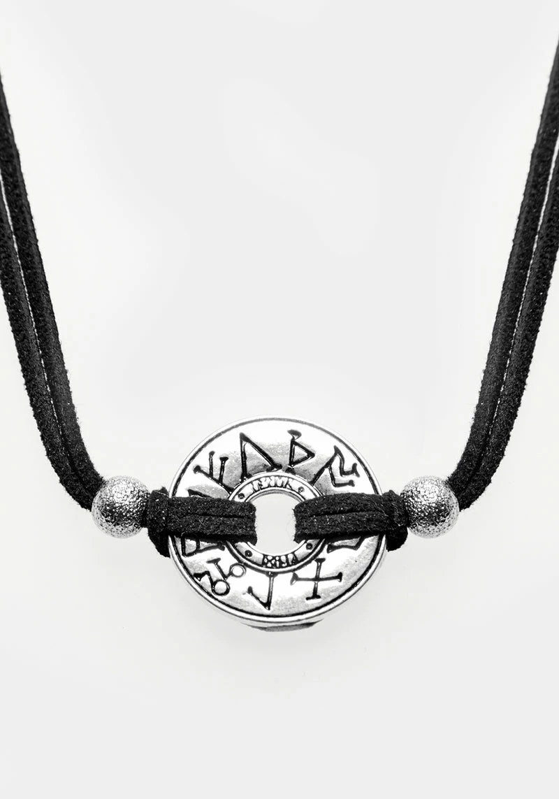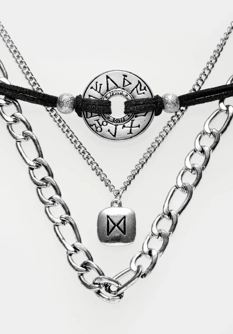 Create your perfect layered necklace look with this stack. Beginning with a faux-leather cord choker and draping into a chunky figaro style and a delicate flat curb chain, this piece gives you the illusion of three perfectly co-ordinated jewellery pieces in one step. Furthark runes imbue your day with the cosmic energy to get you through: channel your affirmations and ambitions through the symbol of your choice and reap the rewards. Â