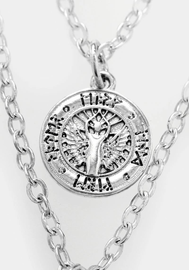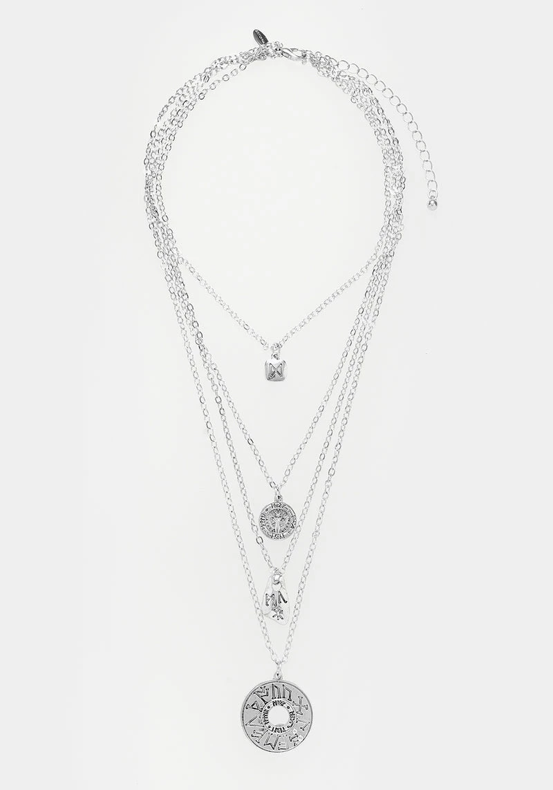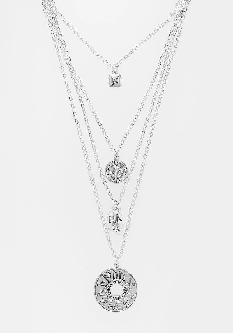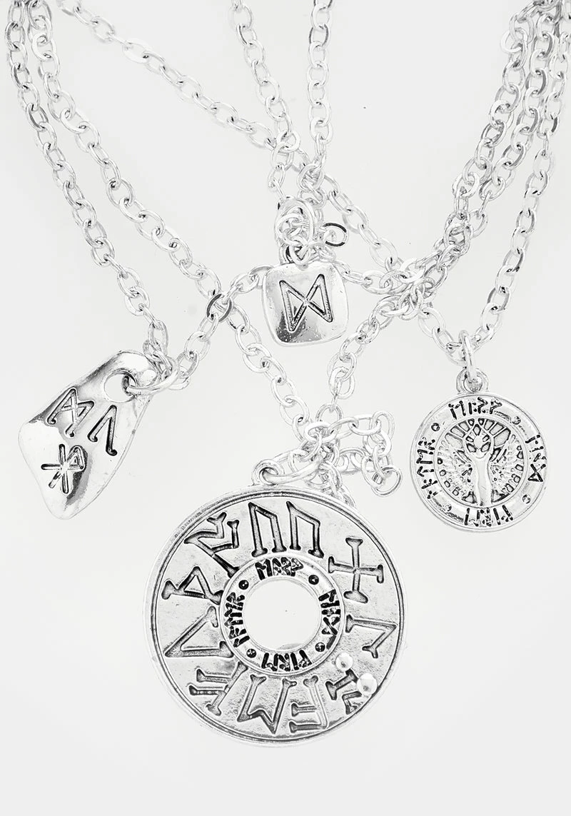 Why settle for one necklace when you can have four? Each fine trace chain holds an etched silver charm; rustic silver nuggets ground you with the earth and engraved coins symbolise personal wealth. Furthark runes imbue your day with the cosmic energy to get you through: channel your affirmations and ambitions through the symbol of your choice and reap the rewards.  Â