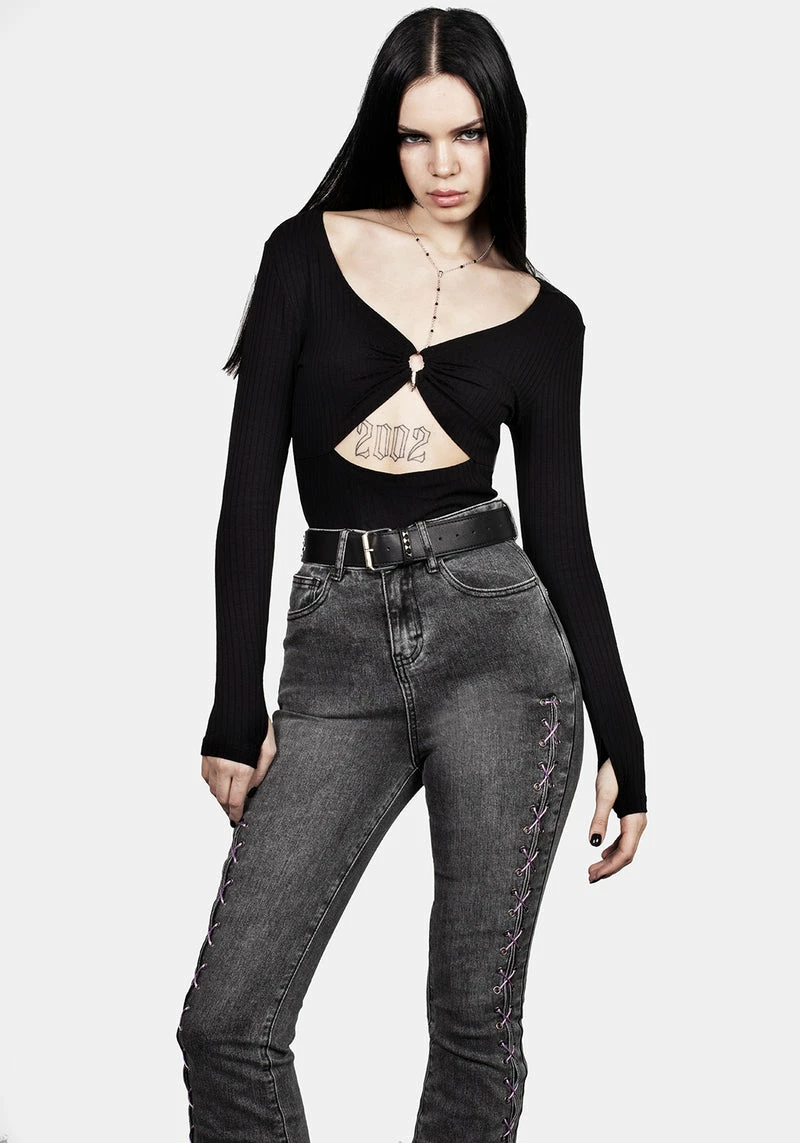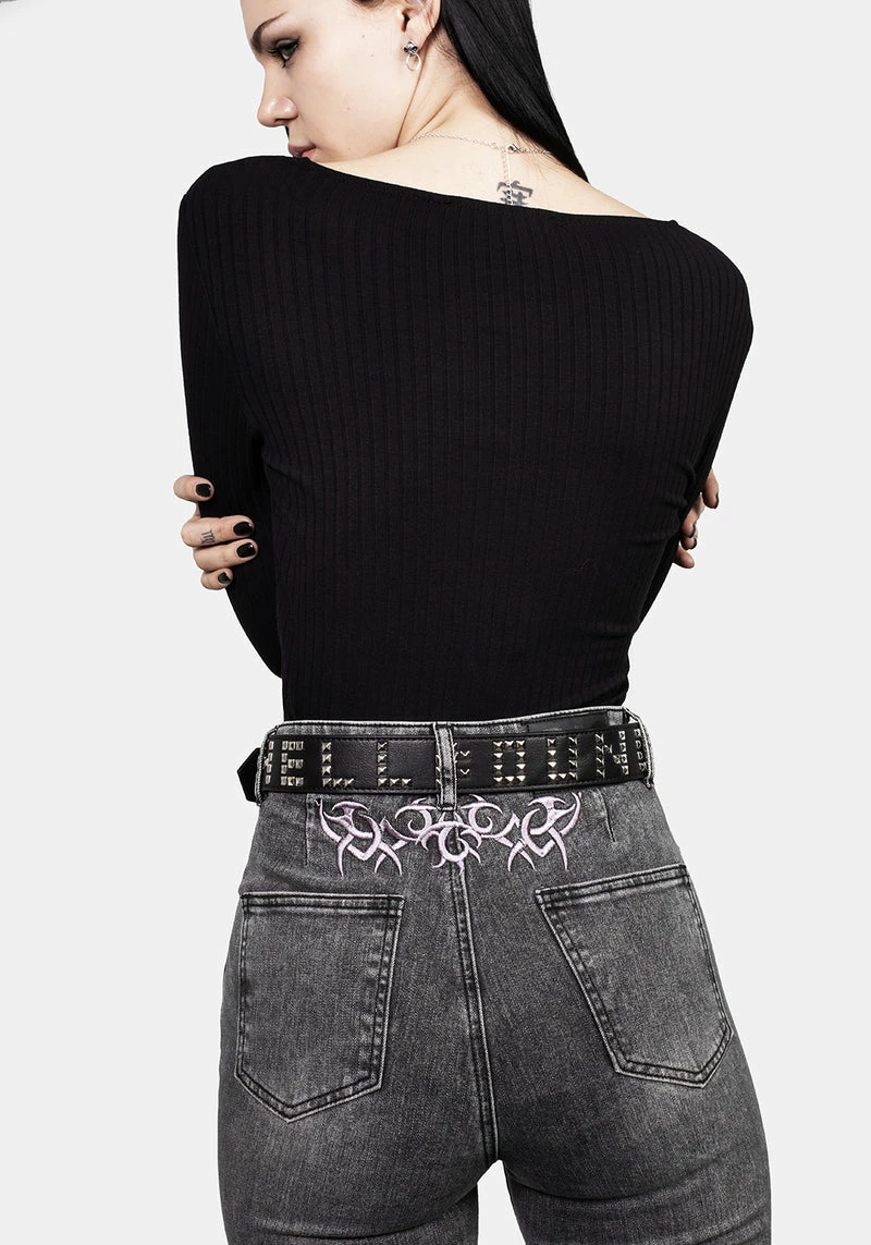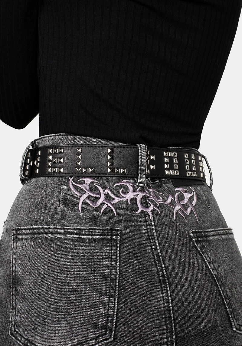 ✦ Silver pyramid studs across back spell out your eternal damnation  Â